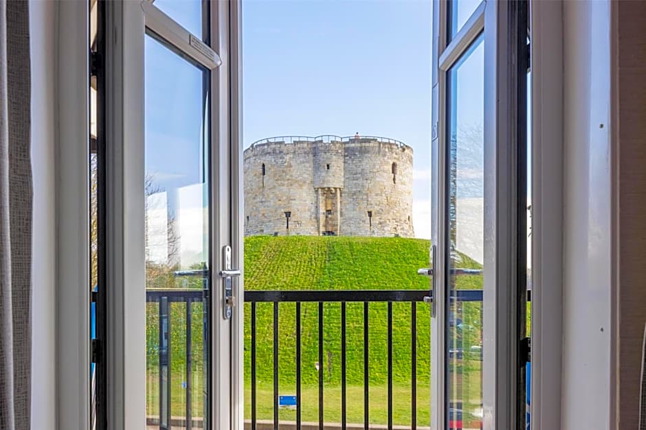 Deluxe Double room with modern decor and view of the Clifford's Tower. The room has air conditioning, Crabtree & Evelyn toiletries and Hilton Serenity bed. This room features complimentary coffee and tea making facilities and HDTV.